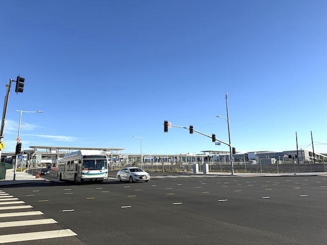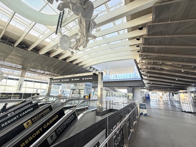 本来であれば、ここから空港ターミナルまで、Automated People Mover(ピープルムーバー)という未来的な乗り物で一直線のはずでした。ところが、2023年完成予定だったこのシステムは、契約トラブルやテストの遅れが重なり、2026年3月現在もまだ稼働していません。オープンは2026年後半以降とも言われています。