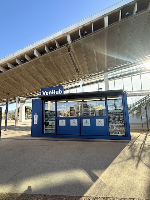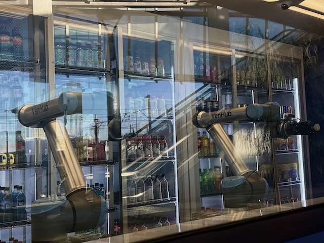 それが、ロボット無人コンビニエンスストア VenHub です。駅と同じく2025年6月にオープンしたもので、コンパクトな空間にかなりの商品数が収められ、高度なカメラ認識や機械学習を活用したロボットアームで商品を取り出す仕組みになっているそうです。